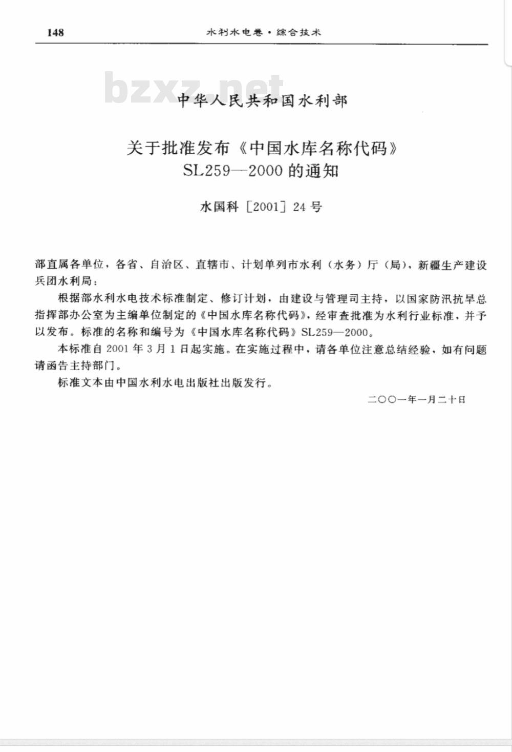 本标准适用于水库信息的编制、存储、检索等领域的管理与应用。 SL 259-2000 中国水库名称代码 SL259-2000