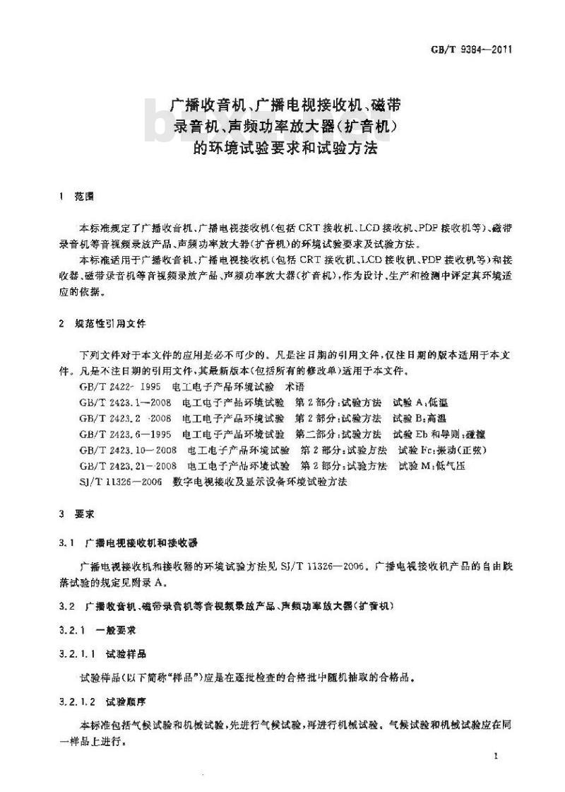 GB/T 9384-2011 广播收音机、广播电视接收机、磁带录音机、声频功率放大器(扩音机)的环境试验要求和试验方法 GB/T9384-2011