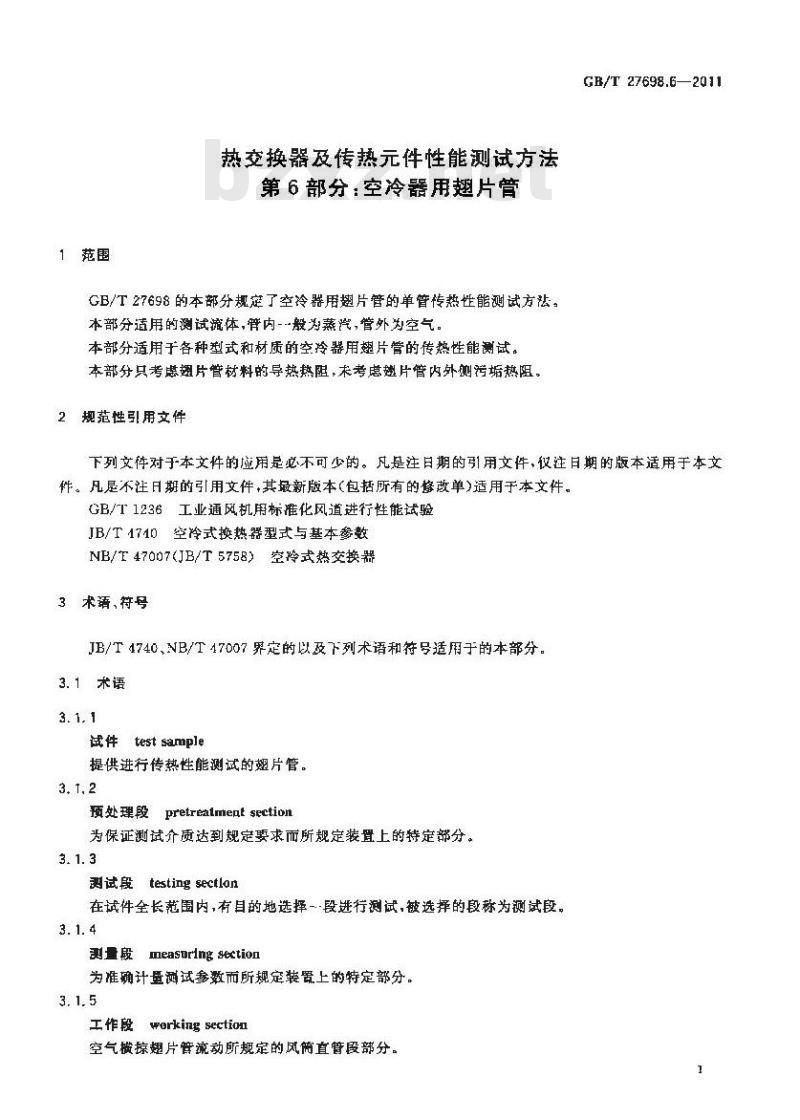 - GB/T 27698.6-2011 热交换器及传热元件性能测试方法 第6部分:空冷器用翅片管