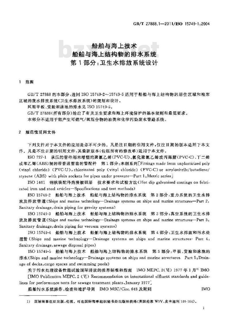 CB/T27888的本部分,连同1S015749-2~15749-5适用于船舶与海上结构物的居住区域和糖库区域的废水排放系统(卫生水排放系统)的规划和设计。风雨甲板、货舱和泳池的排水见ISO15749-5。GB/T27888(所有部分)给出了有关卫生要求和海上环境保护的基本规则和最低要求。本部分不适用于能产生可燃气/氧混合物的油类和化学污染废水管路系统。2规范性引用文件