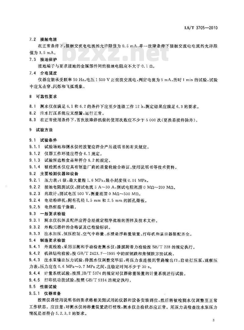 8.1测水仪在满足6.1和6.2的条件下应至少连续工作12h,测定结果应满足6.3的要求。8.2注水打压系统应无泄漏,运行正常。8.3在正常使用条件下,首次故障停机前的使用次数应不少于5000次(更换易损件除外)。9试验方法