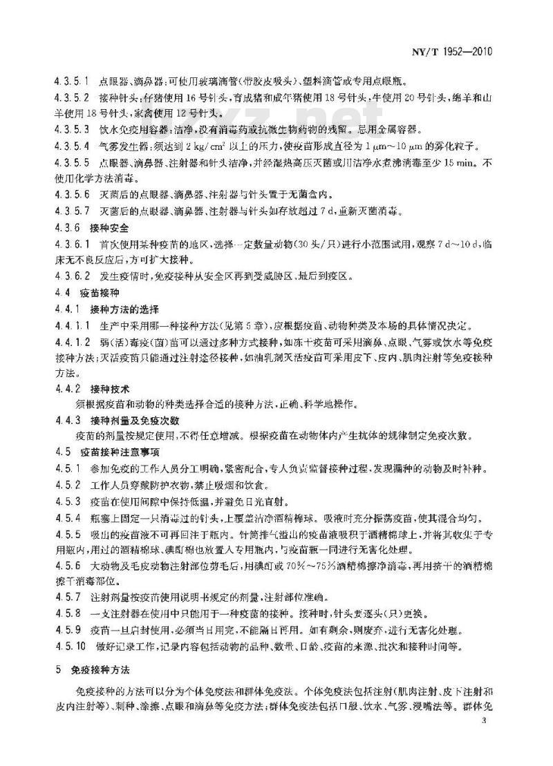 4.4.1.1生产中采用哪一种接种方法(死第5章),应根据疫苗、动物种类及本场的具体情况决定4.4.1.2弱(活)毒疫(菌)苗可以通过多种方式接种,如冻干疫苗可采用滴鼻、点眼、气雾或饮水等免疫接种方法;灭疫只能通过注射途径接种,妩油乳剂灭活疫苗可来用皮下、皮内、肌肉注射等免疫接种方法。