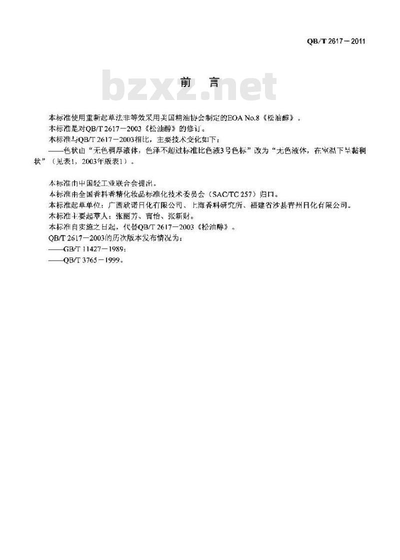 本标准巾中国轻工业联合会提出。本标准由全国香料香精化妆品标准化技术委员会(SAC/TC257)归口。本标准起草单位:广西欣诺日化有限公司、上海香料研究所、福建省沙县青州日化有限公司。本标准要起草人:张丽芳、曹怡、张新财。本标雅自实施之日起,代替QB/T2617一2003‘松冲醇》。QB/T2617一2003的历次版本发布情况为:GB/T 11427—1989: