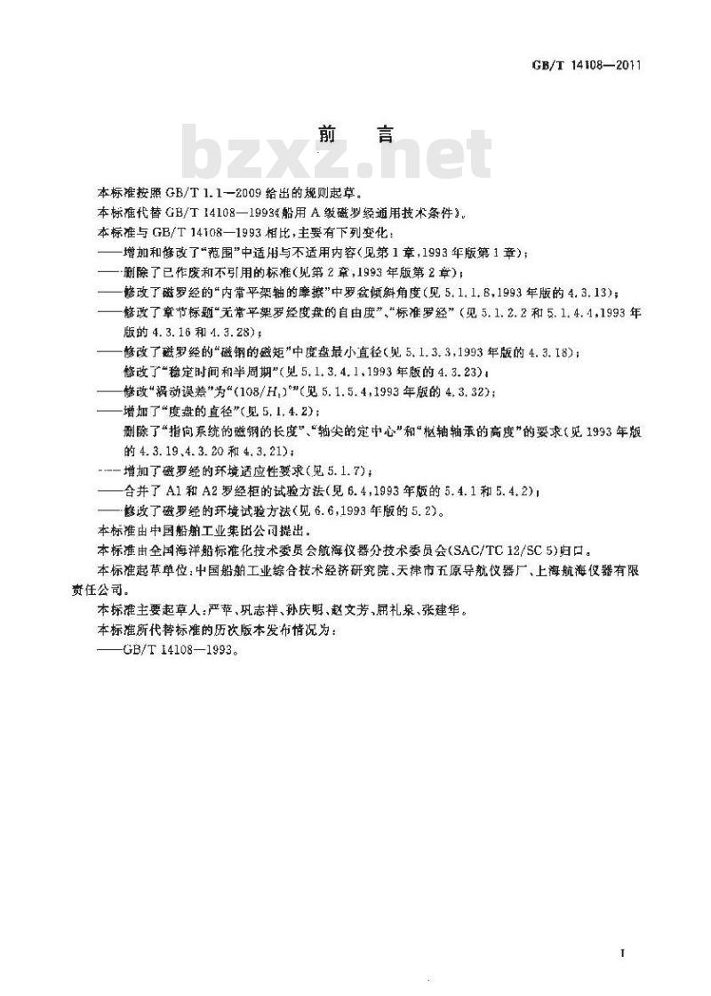 本标准按照GB/T1.1—2009给出的规则起草。本标推代替GB/T14108—1993船用A级磁罗经通用技术条件》本标准与GB/T14108—1993相比,主要有下列变化:增加和條改了“范围\中适用与不适用内容(见第1章,1993年版第1章);删除了已作废和不引用的标准(见第2章,1993年版第2章)GB/T 14108—2011