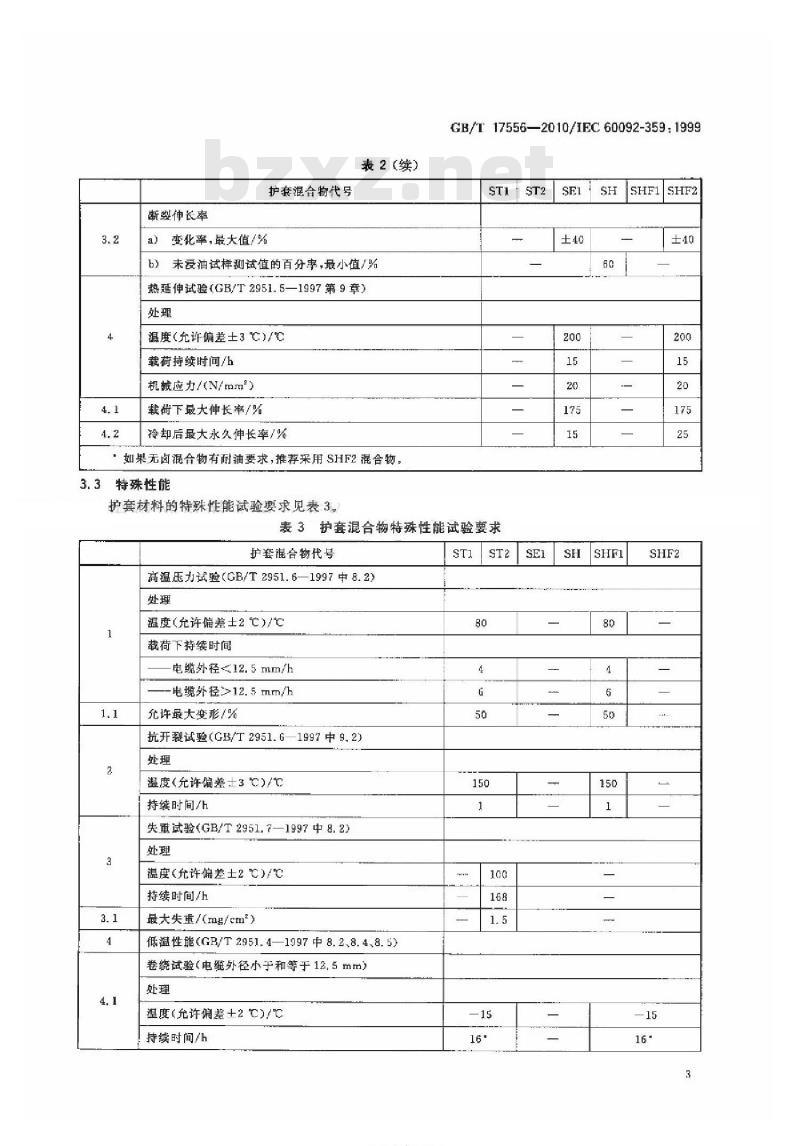 护套材料的特殊性能试验要求见表3。GB/T 175562010/IEC60092-359:1999ST1ST2