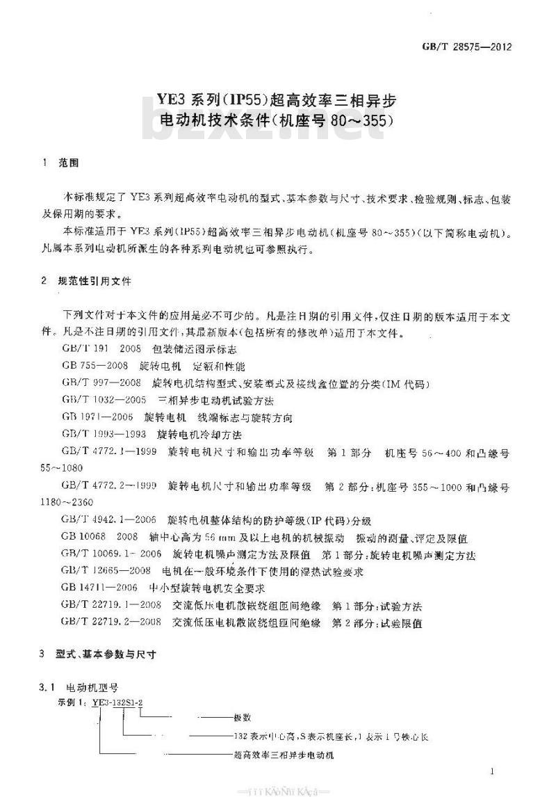 - GB/T 28575-2012 YE3系列(IP55)超高效率三相异步电动机技术条件(机座号80~355)