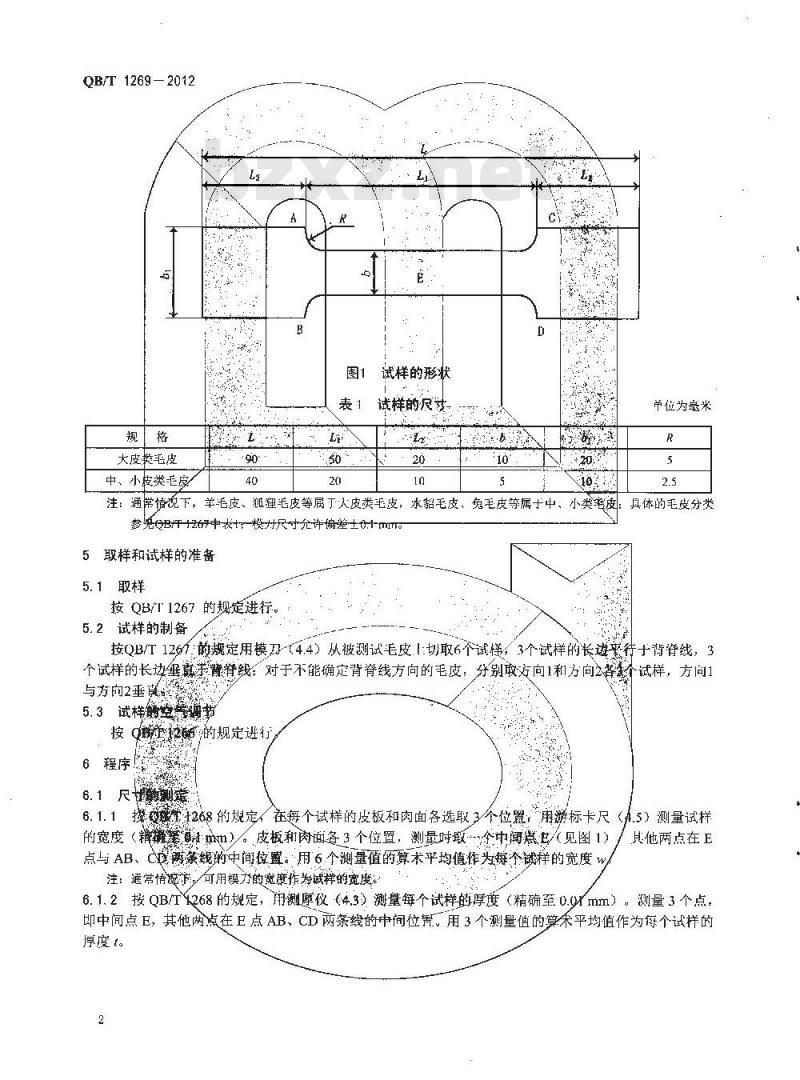 注:通常情说下,羊毛皮、狐狸毛皮等属丁大皮类毛皮,水貂毛皮,免毛皮等属于中、小类参死@BT1267中表t-模尺寸允许偏差±0.1-mmra5取样和试样的准备