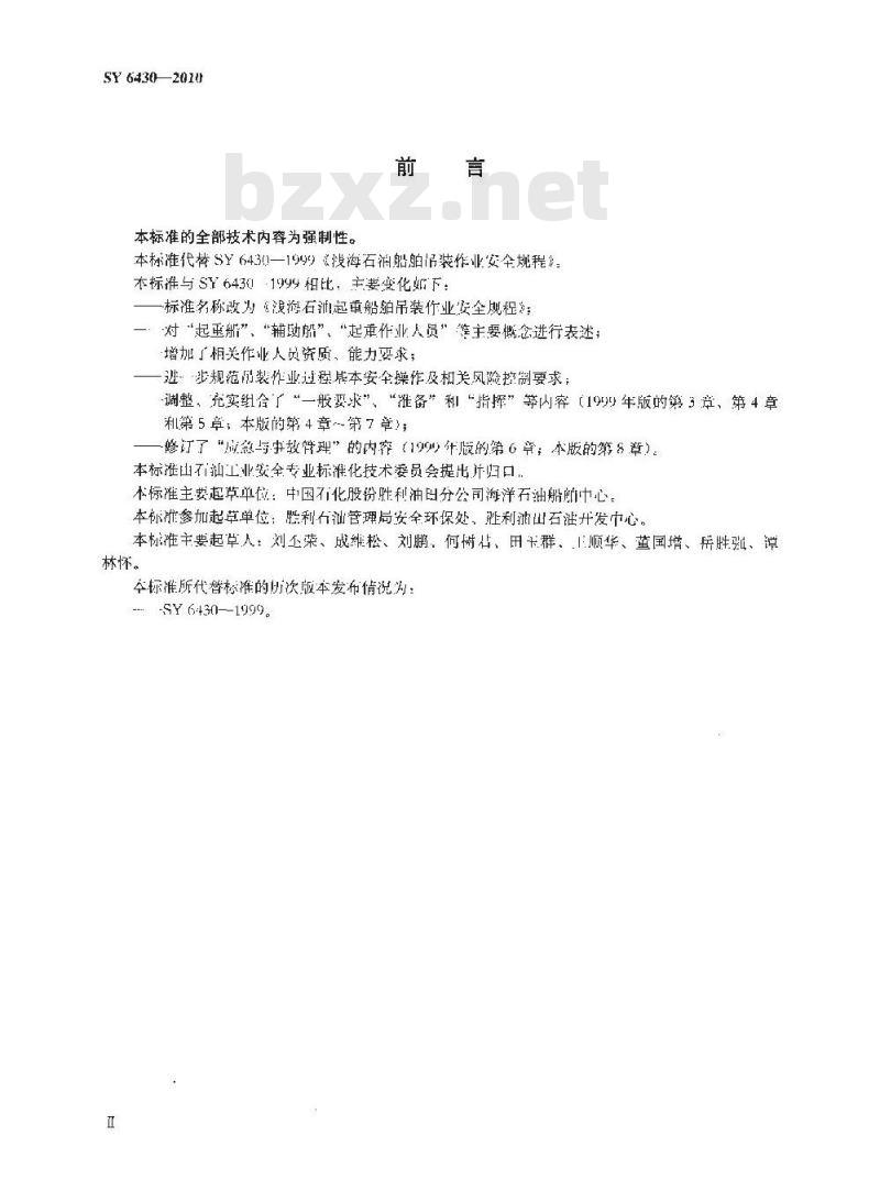 本标准代替SY6430—199《技海石润船舶品装作业安全规程本标准与SY6430-1999相比:主要变化如下:标准名称改为浸海石洲起重船舶吊装作业安全规程::对“起重册”、“辅助船”、“起重作业人员”等主要概念进行表述;增加了相关作业人员资质,能力要求;一进:步规范品装作业过程本安全操作及相关风险控制要求:-调整,充实组全了“一般要求”、“准备”和“指挥”等内容(19\年版的第3章、第4章和第5章;本版的第4章第7章);修订了“成急与牢故理”的内窄(199)年版的第6章;本版的第8章)本标准山石汕工业安全专业标准化技术委员会提出开归口本标准主要起草单位:牛国不化股份胜利油巴分公司海洋石油船中心:本标雅参加起草单位:胜利石汕管理局安余环保处、胜利泌山石油开发中心本准主要起草人:刘丕荣、成维松、刘鹏、何树古、田卡群、正顺华、董国增、岳胜独、谭林怀。