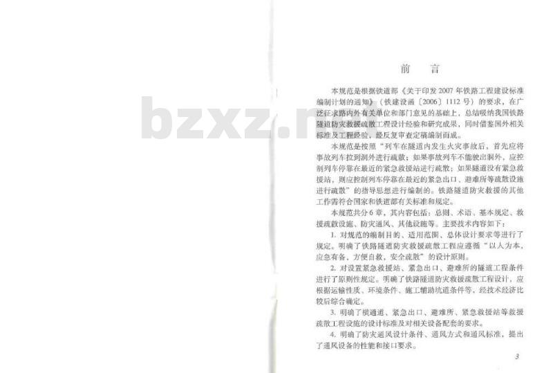 本规范是根据铁道部《关于印发2007年铁路工程建设标准编制计划的通知》:(铁建设函【2006】1112号)的要求,在广泛征求路内外有关单位和部门意见的基础上,总结吸纳我国铁路隧道防灾教援疏散工程设计经验和研究成果,同时借鉴国外相关标准及工程经验,经反复审查定稿编制而成。本规范是按照“列车在隧道内发生火灾事故后,首先应将事故列车拉到洞外进行疏散;如果事故列车不能驶出洞外,应控制列车停靠在最近的紧急救援站进行疏散:如果隧道没有紧急救援站,则应控制列车停靠在最近的紧急出口、避难所等疏散设施进行疏散”的指导思想进行编制的。铁路隧道防灾救援的其他工作需符合国家和铁道部有关标准和规定。本规范共分6章,其内容包括:总则、术语、基本规定、救援疏散设施、防灾通风、其他设施等。主要技术内容如下:1.对规范的编制目的、适用范围、总体设计要求等进行了规定。明确了铁路隧道防灾救援疏散工程应遵循“以人为本,应急有备,方便自救,安全疏散”的设计原则。2.对设置紧急救援站、紧急出口、避难所的隧道工程条件进行了原则性规定。明确了铁路隧道防灾救援疏散工程设计,应根据运输性质、环境条件、施工辅助坑道条件等,经技术经济比较后综合确定。bzxz.net