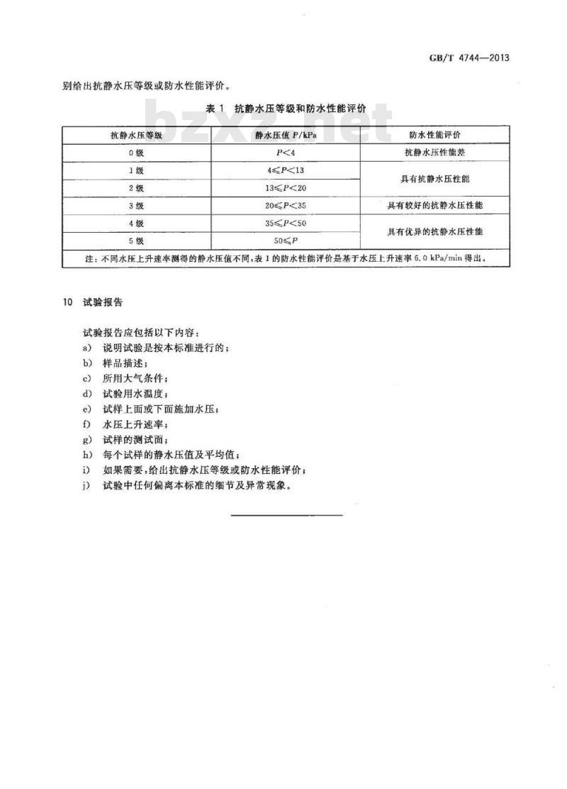 每个试样的静水压值及平均值;如果需要,给出抗静水压等级或防水性能评价;试验中任何偏离本标准的细节及异常现象GB/T4744-2013