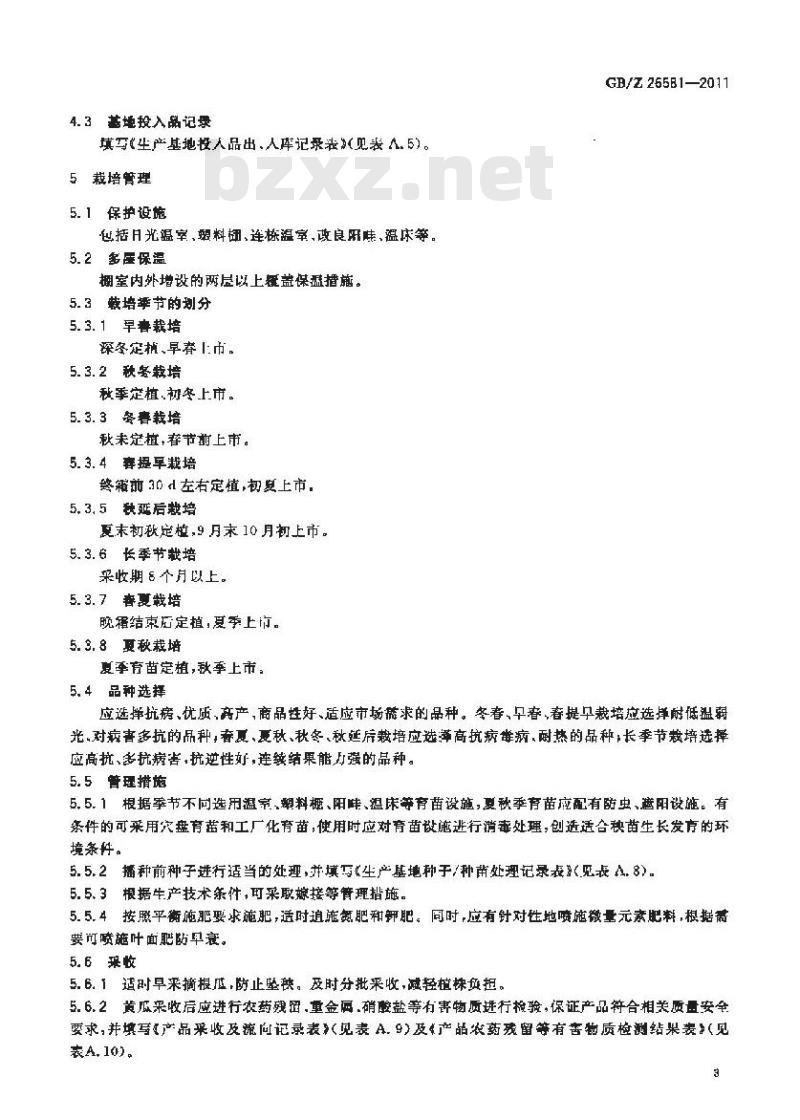 5.5.2播种前种子进行适当的处理,并填写生产基地种于/种苗处理记录表(见表A,8)。5.5、.3根据牛产技术条件,可采取嫁接等普理措施5.5.4按照平衡施肥要求施肥,适时迫施氮肥和钾肥。同时,应有针对性地喷随微量元素肥料,根据需要可喷葩叶面肥贴早衰。