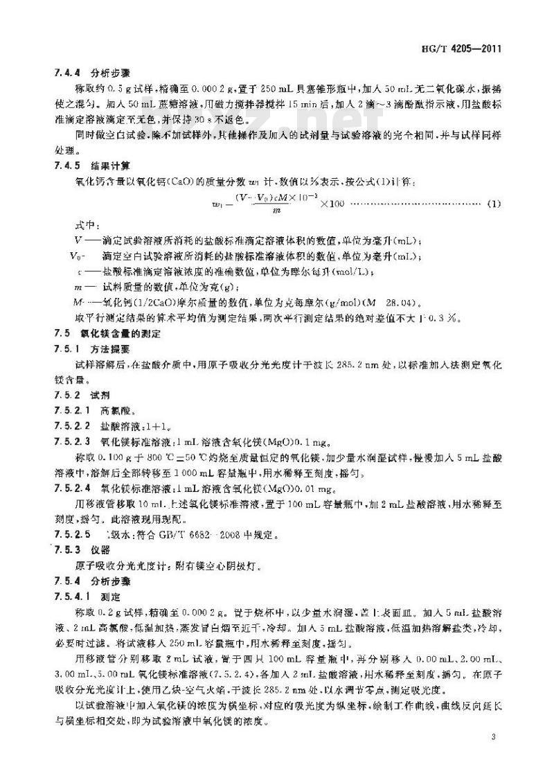 7.5.2.3氧化镁标准溶液:1ml.溶液含氧化镁(MgO0)0.1mg。称取 0.100 g于800 ℃ =50C灼烧至质量恒定的氧化镁,加少量水润湿试样,慢慢加人 5mL盐酸溶液中,溶解后全部转移至1000mL容量瓶中,用水稀释至刻度,播勺:7.5.2.4氧化镁标准溶液:lmL溶液含氧化镁(Mg0)0.01mg。川移液管移取 10 ml. .上述氧化镁标准溶液.置于 100 mL容量瓶中,加2 mL盐酸溶液,用水稀释至刻度,摇句。此溶液现用现配,7.5.2.5级水:符合GB/T6682200名中规定。7.5.3仪器