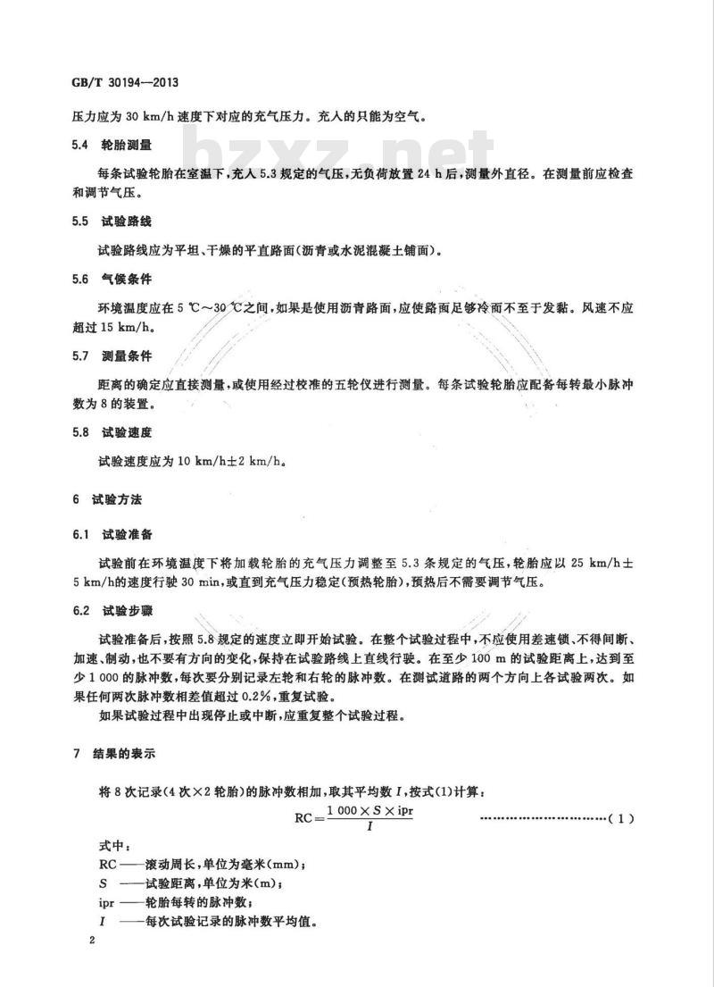 本试验方法是在平、直、水平的路面上,以恒定的速度驾驶驱动轴上安装有试验轮胎的车辆,计数其在一段经准确测量的距离发生的轮胎转数。5试验条件