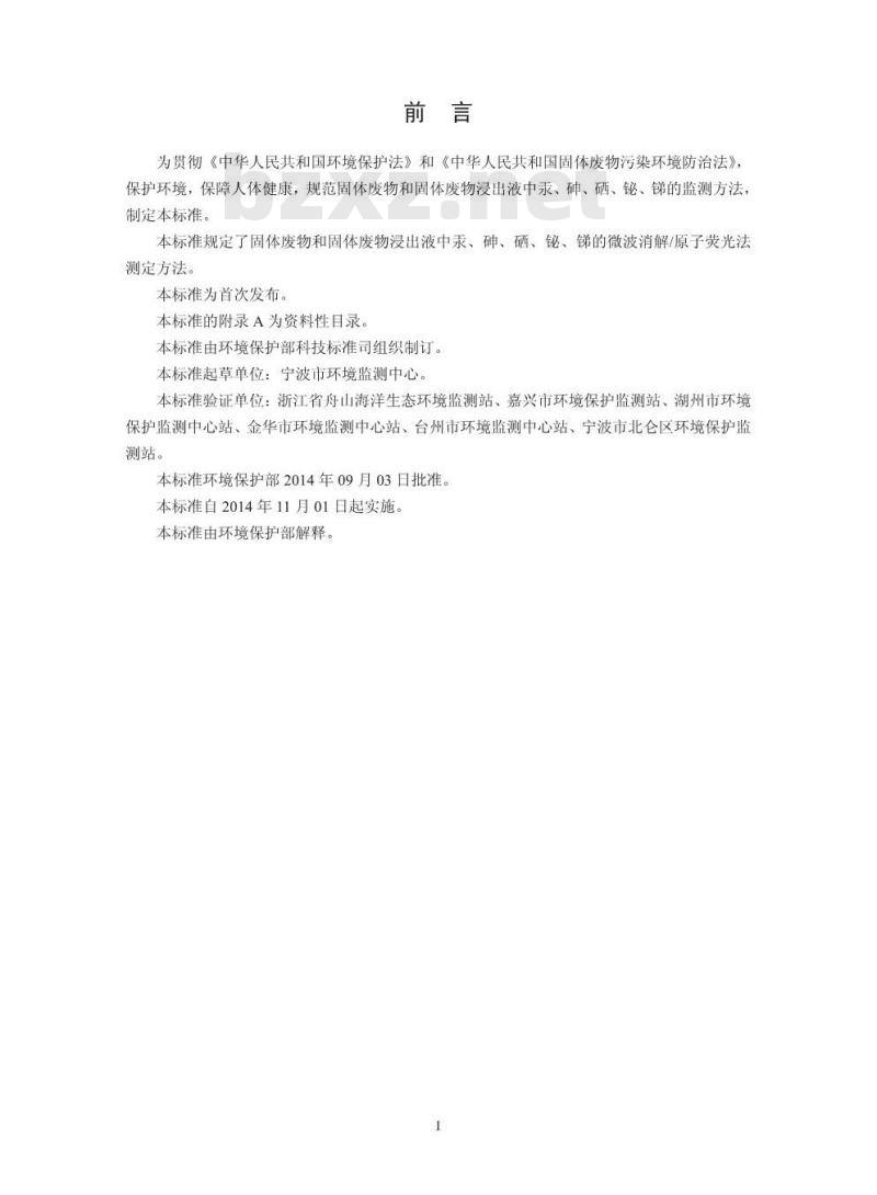 为贯彻《中华人民共和国环境保护法》和《中华人民共和国固体废物污染环境防治法》保护环境,保障人体健康,规范固体废物和固体废物浸出液中汞、砷、硒、铋、锑的监测方法制定本标准。