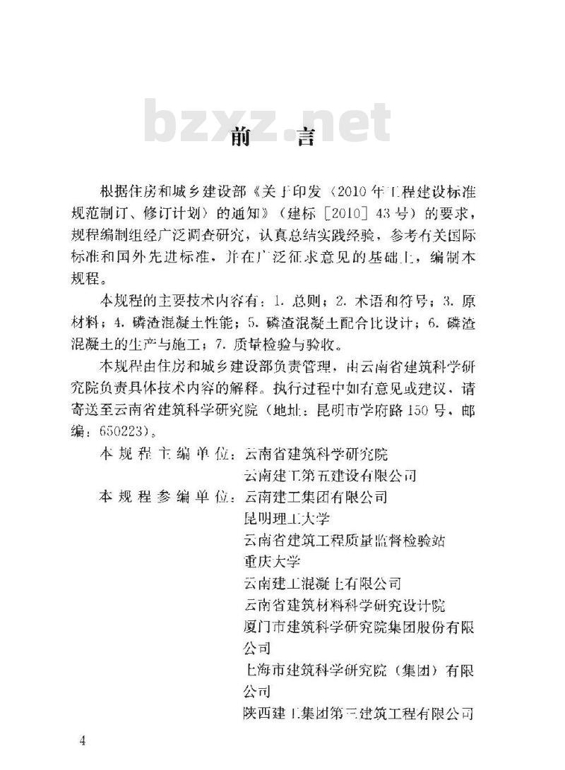 本规程的主要技术内容有:1.总则;2.术语和符号;3.原材料;4.磷渣混凝土性能;5。磷渣混凝土配合比设计;6磷渣混凝土的产与施工:7.质量检验与验收,本规程由住房和城乡建设部负责管理,出云南省建筑科学研究院负责具体技术内容的解释。执行过程中如有意见战建议,请寄送至云南省建筑科学研究院(地址:昆明市学府路150号,邮编:650223)。