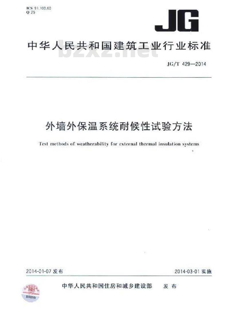 - JG/T 429-2014 外墙外保温系统耐候性试验方法
