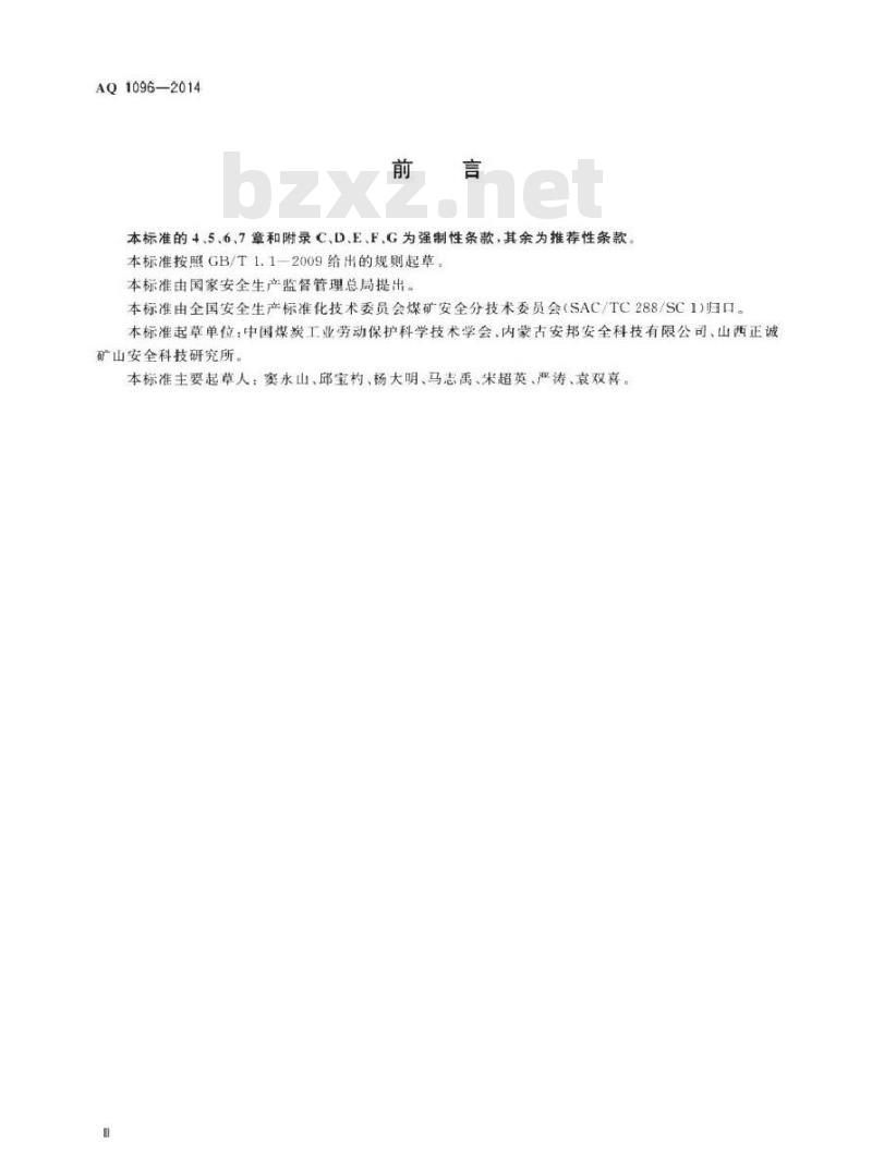 本标准的4、5、6、7章和附录C、D、E、F.G为强制性条款,其余为推荐性条款本标准按照GB/T1.1-2009给出的规则起草。本标准由国家安全生产监督管理总局提出。本标准由全国安全生产标准化技术委员会煤矿安全分技术委员会(SAC/TC288/SC1)归口。本标准起革单位:中国煤炭工业劳动保护科学技术学会、内蒙古安邦安全科技有限公司,山西正诚矿山安全科技研究所。