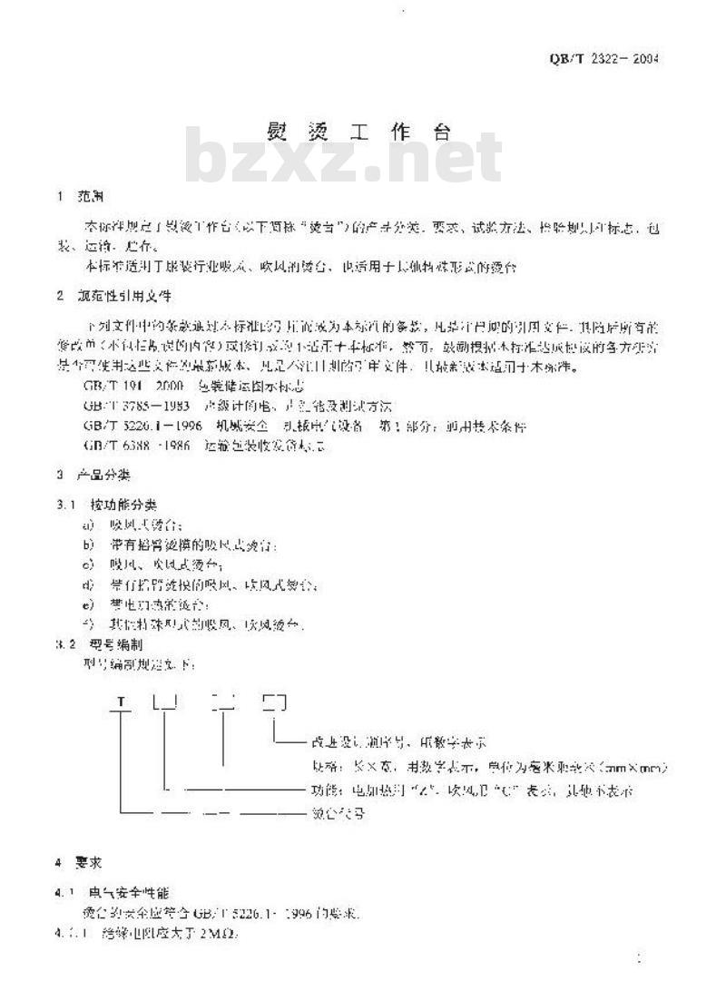 本标准规定了熨烫工作台(以下简称“烫台”)的产品分类、要求、试验方法、检验规则和标志、包装、运输、贮存。本标准适用于服装行业吸风、吹风的烫台,也适用于其他特殊形式的烫台。 QB/T 2322-2004 熨烫工作台 QB/T2322-2004