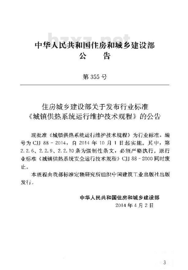 住房城乡建设部关于发布行业标准《城镇供热系统运行维护技术规程》的公告现批准城镇供热系统运行维护技术规程”为行业标准,编号为CJ88-2014,白2014年[0月1日起实施。其中,第2.2.6、2.2.9,2.2.10条强制条文,必须严格执行,原行此标准城镇供热系统安全运行技术规程》CJI88-2000同时废止。
