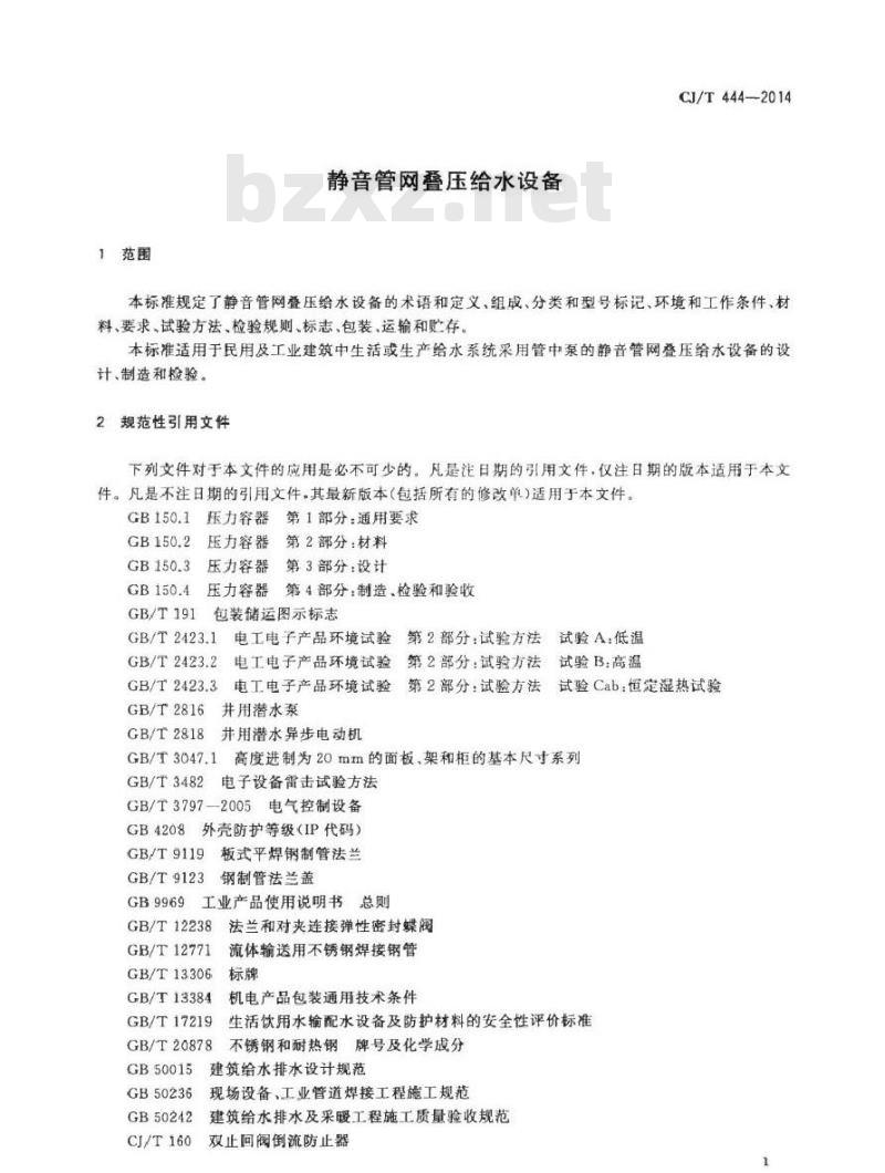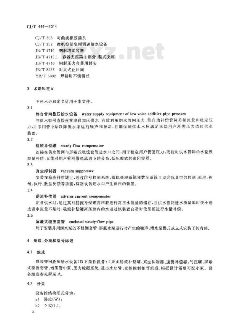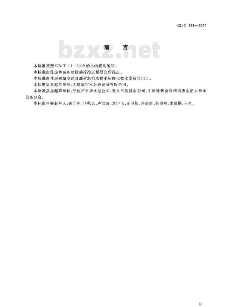 本标准按照GB/T1.1—2009给出的规则编写。本标准由住房和城乡建设部标准定额研究所提出。本标准由住房和城乡建设部建筑给水排水标准化技术委员会归口。本标准负责起草单位:无锡康宇水处理设备有限公司。CJ/T444—2014