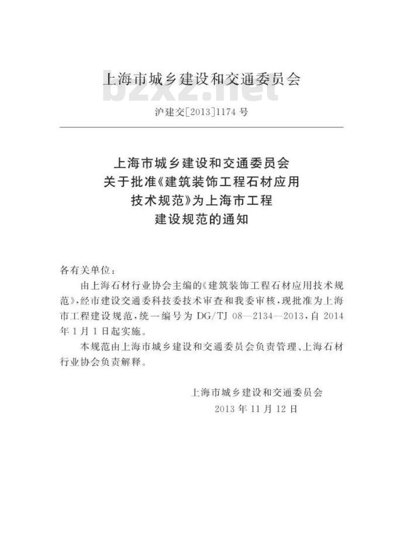 由上海石材行业协会主编的《建筑装饰工程石材应用技术规范》,经市建设交通委科技委技术审查和我委审核,现批准为上海市工程建设规范,统一编号为DG/TJ08一21342013,自2014年1月1日起实施。