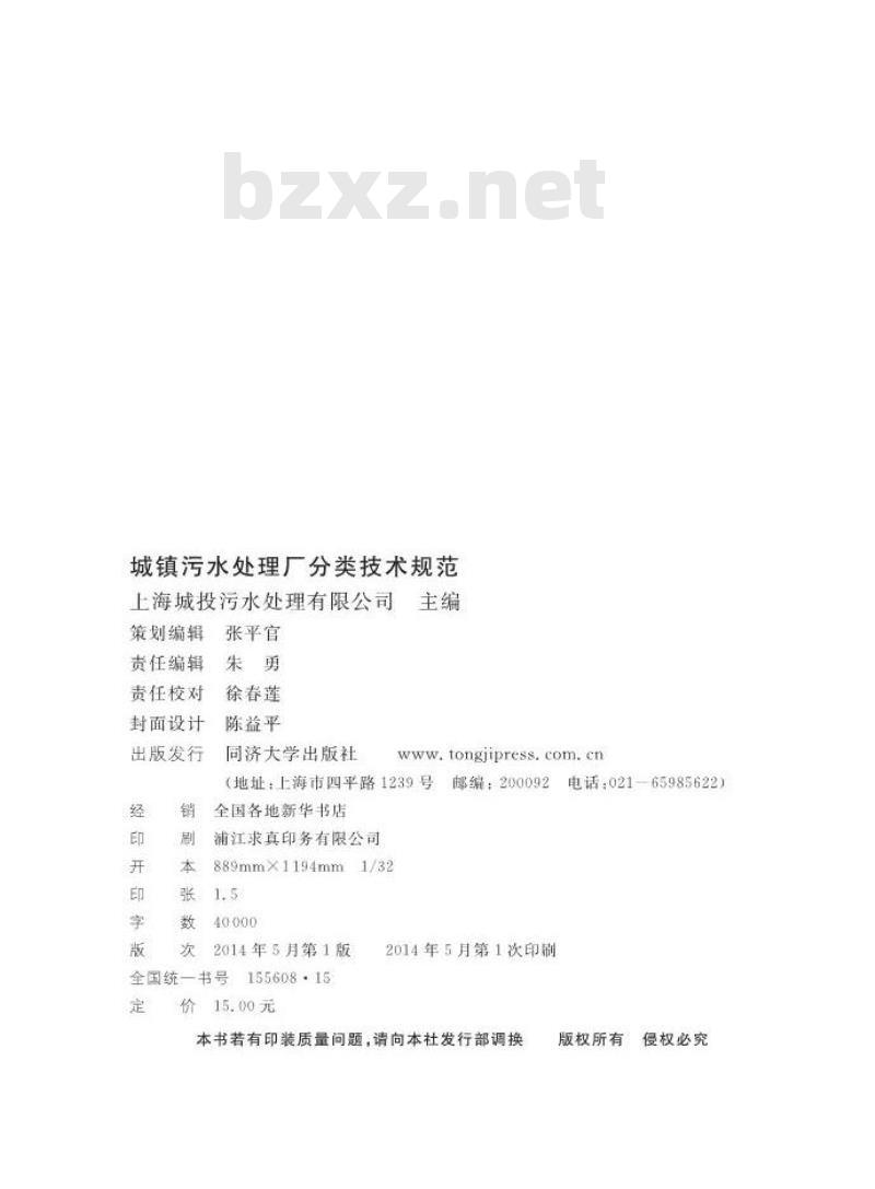 根据上海市城乡建设和交通委员会《上海市城乡建设和交通季员会关干印发(2012年上海市工程建设规范和标准设计编制计划)的通知》(沪建交2012281号)的要求,为了提高城镇污水处理工程项目决策和建设的科学管理水平,合理确定和正确掌握建设标准,强化城镇污水处理厂运行管理能力合理安排工程建设、维修、维护和运行管理费用,以要系管理的方式促进技术进步,本规范编制组经过广泛调查研究,认真总结城镇污水处理广分类经验,参考有关国际和国外先进标准,在广泛征求意见的基础上,制订《城镇污水处理厂分类技术规范》(以下简称《规范》)。本《规范》的主要技术内容包括:1总则:2术语:3一般规定;4污水处理工艺与分类指标:5污泥处理处置工艺与分类指标;6臭气处理工艺与分类指标:7污水处理厂的环境指标:8污水处理厂的其他分类指标:9主要技术经济指标。本《规范》在执行过程中,如发现需作修改、补充处,请将意见和有关资料寄送上海城投污水处理有限公司(地址:上海市浦东新区龙东大道1851号,邮编201203),以便今后修订时参考。主编单位:上海城投污水处理有限公司参编单位同济大学