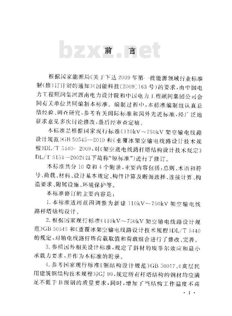 根据能源局《关」下达2009年第·-批能源领行业标准制(修)订计划的通知》国能科技2009163号)的要求,由中国电力工程顾问集团西南电力设计院利中国电力1程顾问集团公司会同有美单位共同编制本标准。编制过程4,本标准编制组认真息结纶验、调件研究,参考有关国际标准和国外先进标准,经广泛地征求意见多次讨论修政,最后经市查定稿:本标准足根据国家现行标准《110kV~750kV架空输电线路设计规范》GB50545一2010和《重覆冰架空输电线路设计技术规程》DL/T5440-2009,对《架空送电线路杆塔结构设计技术规定》DL/T5154--2002(以下简称*原标准”)进行了修订。本标准共分10章和4个附录,主要内容包括:总则、术语和符号、荷载、材料、设计基本规定、构件计算及断面选择,连接计算、构造要求、附属设施、环境保扩等。本标准修订的主要内容是: