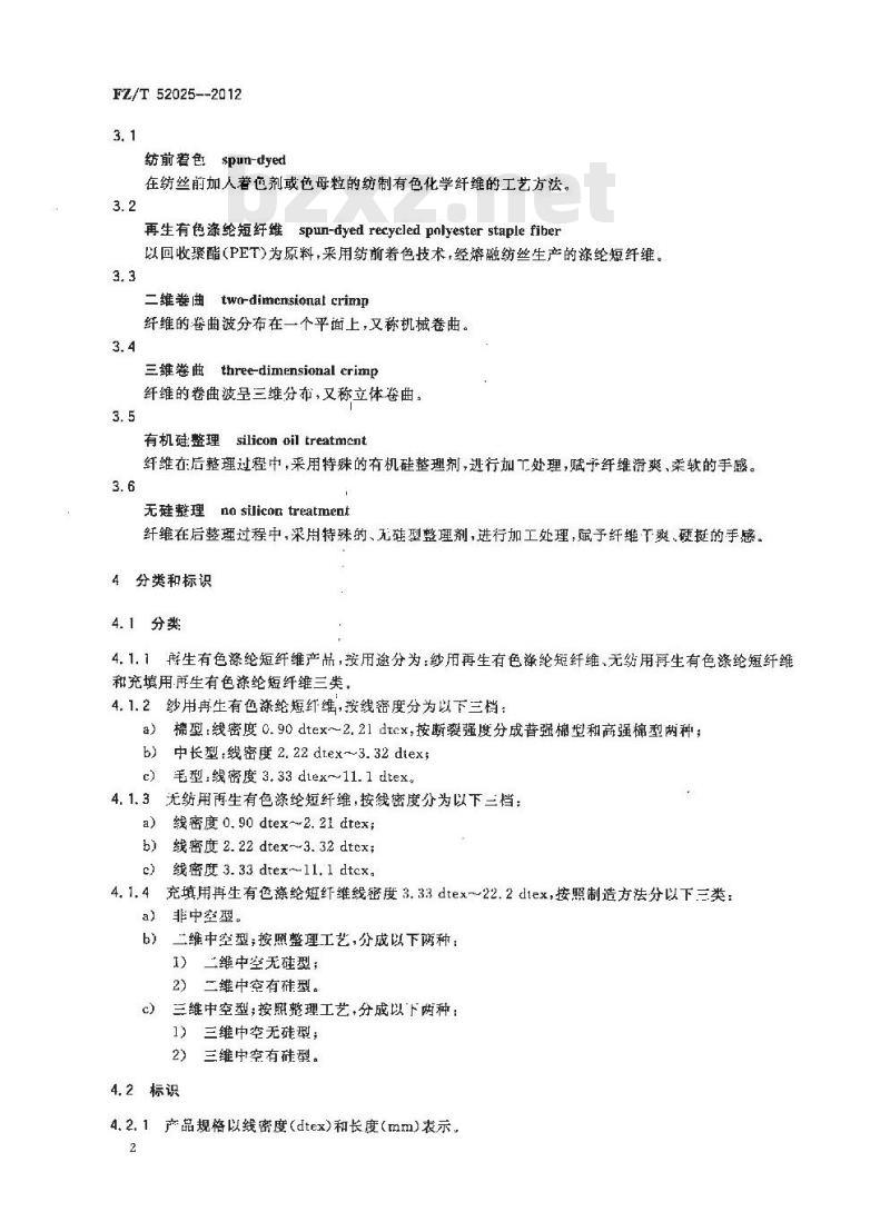 示例:1.33dtex×38mm,其中1.33dtex表示线密度,38mm表示切断长度,4.2.2产品按产品规格、色泽来标识。FZ/T 52025—2012