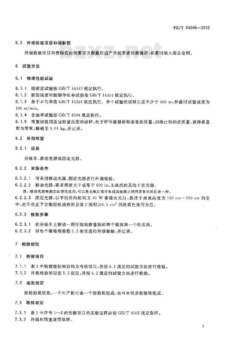 6.1.4含油率试验按GB/T6504规定执行。6.1.5筒重试验用适宜称量范围的磅秤、电子秤等衡器称取卷装的质量,扣除已知的皮质量,该净质量即为筒重,精确至 0. 01 kg,并记录。6.2外观检验免费标准下载网bzxz