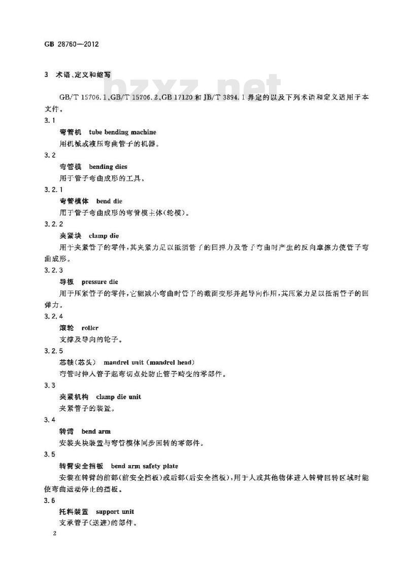 本标准规定了弯管机的设计和制造所应遵守的安全要求和/或措施、验证、使用信息、用户责任。本标准适用于冷态下弯曲的缠绕式弯管机,包括机械弯管机、液压弯管机、数控弯管机、小半径弯管机及可能包含的上、下料等辅助装置;不适用于专用的弯管器,弯管机辅助设备,如锯料管端成型、检测等机械或装置及由专用弯管机组成的生产线。2规范性引用文件