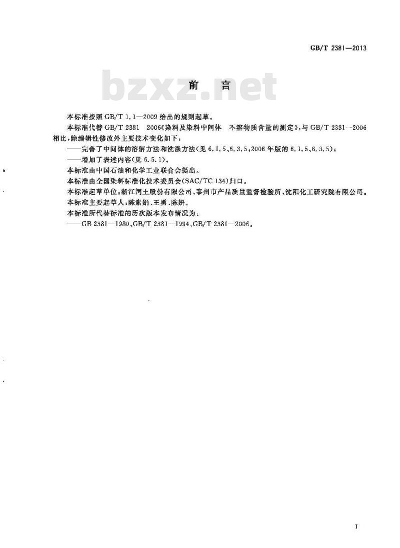 本标准由中国石油和化学工业联合会提出。本标准由全国染料标准化技术委员会(SAC/TC134)归口。本标准起草单位:浙江闻土股份有限公司、泰州市产品质量监督检验所、沈阳化工研究院有限公司。本标准主要起草人:陈素娟、王勇.陈妍。本标推所代替标推的历次版本发布情况为:GB2381—1980.GB/T2381—1994、GB/T2381—2006。1