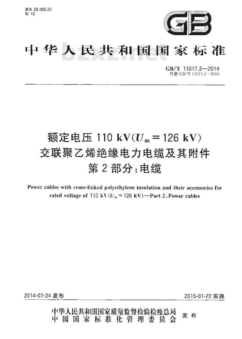 GB/T 11017.2-2014 额定电压110kV Um126kV 交联聚乙烯绝缘电力电缆及其附件 第2部分 电缆 GB/T11017.2-2014