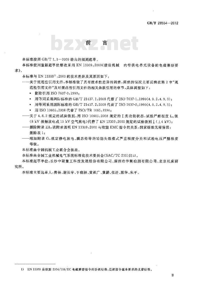 本标推主要起草人:杨、谢长宇,于晓颖、黄祖广、黄麟、张迁、陈华、朱平。1)EN13309是欧显 2004/108/EC电磁兼容指令的协调标准,起该指令基本要求的支择标准。1范围