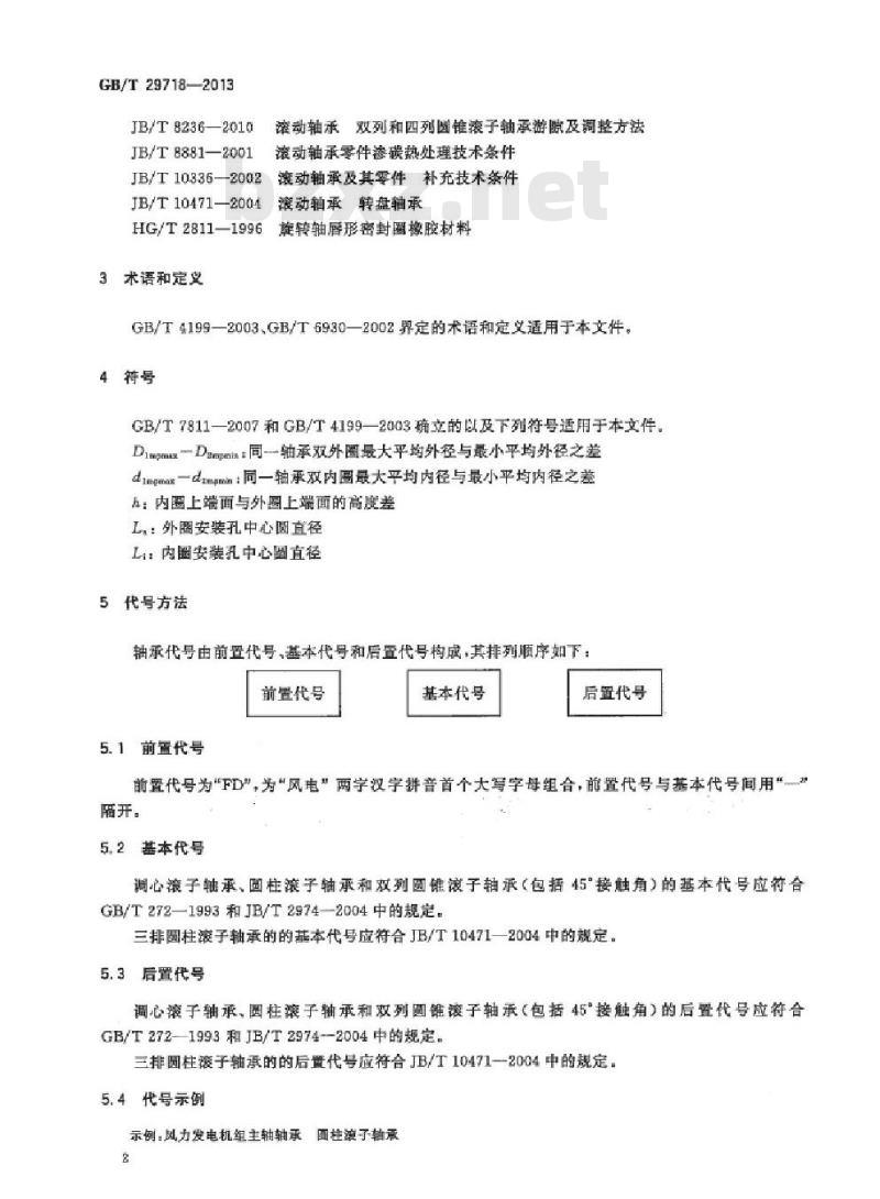 调心滚子轴承、圆柱滚子轴承和双列圆锥镀子轴承(包括45接触角)的后置代号应符合GB/T272—1993和JB/T2974--2004中的规定。三排圆柱废子轴承的的后置代号应符合JB/T10471一2004中的规定。5.4代号示例