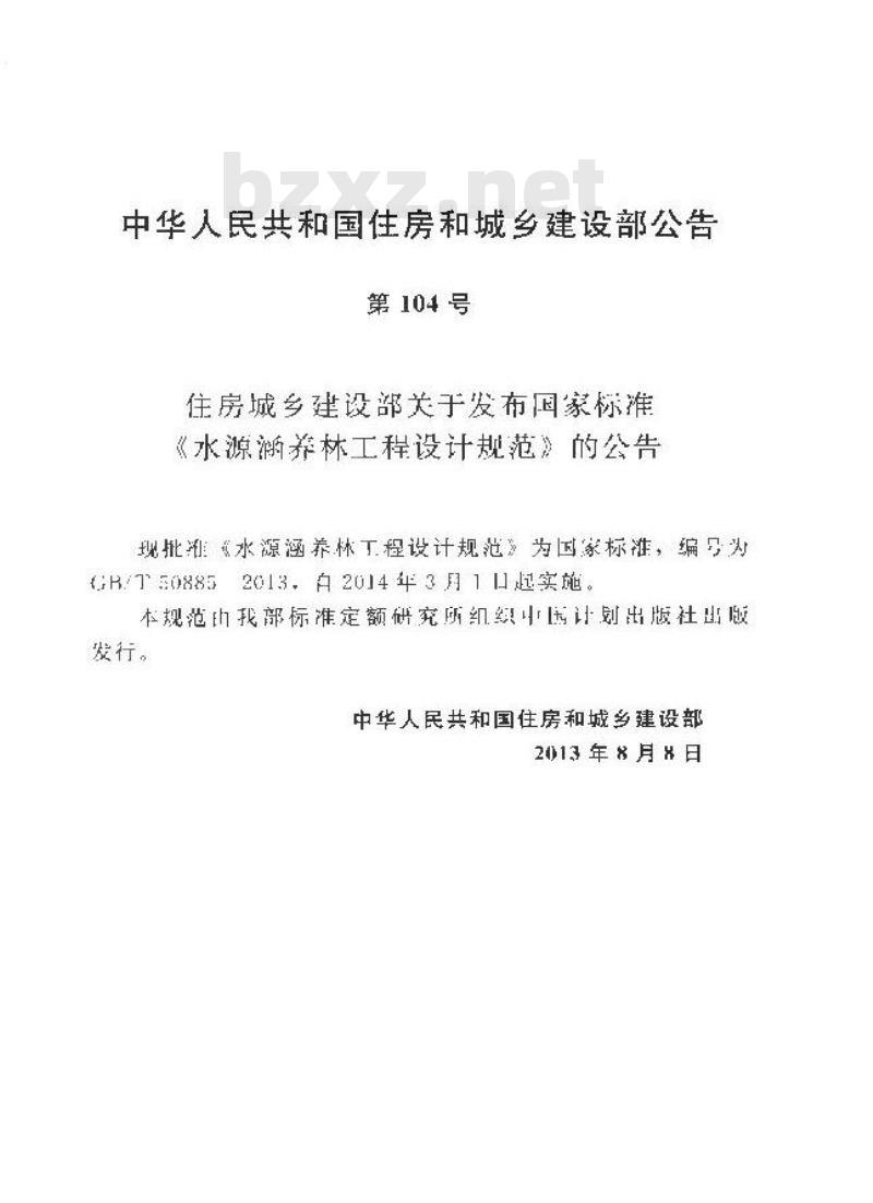住房城乡建设部关于发布国家标准《水源渐养林工程设计规范》的公告现批理水源涵养林工程设计规范》为国家标雅,编头7508852013,自2014年3周11起实施。本规范山我部标准定额研究所组织中计剧出版社出版发行。