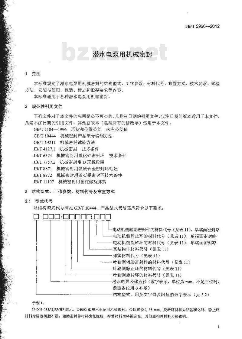本标准按照GB/T1.1—2009给出的规则起草。本标准代替JB/T5966—1995《潜水电泵用机械密封》,与JB/T5966—1995相比要技术变化如下一修改了规范性引用文件:所列标准均现行有效;-调整了原标推密封基本型式及其使用参数:-增加了型式代号及布置方式: