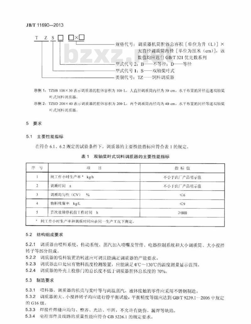 示例2:TZSD200×40表示调质器的腔体容积为200L,两个调质简内径均为40cm,水半布置的同径等速双轴奖叶式创料调质器。bzxz.net
