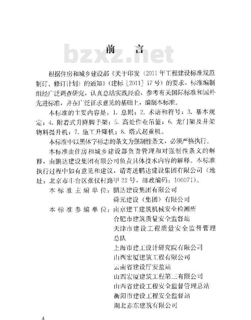 根据住房和城乡建设部《关于印发《2011年工程建设标准规范制订、修订计划)的通知》(建标[2011717号)的要求,标准编制组经广泛调查研究,认真总结实践经验,参考有关国际标准和国外先进标准,并在广泛征求意见的基础上,编制本标准。本标准的十要内容是:1.总则;2.术语和符号:3.基本规;4。附着式刀降脚于架;5.高处作业吊篮;6.龙门架及开物料提升机:7.施丁升降机,8,塔式起重机,本标准以黑体字标志的条文为强制性条文,必须严格执行。本标准由代房利城乡建设部负责管理和对强制性条文的解释,出鹏达建设集团有限公司负贞具体技术内容的解释。本标准执行过程如有意见和建议,请寄送鹏达建设集团有限公司(地址:北京市台区张仪村路22号:邮政编码:100071)。本标准主编单位:鹏达建设集团有限公司舜元建设(集团)有限公司
