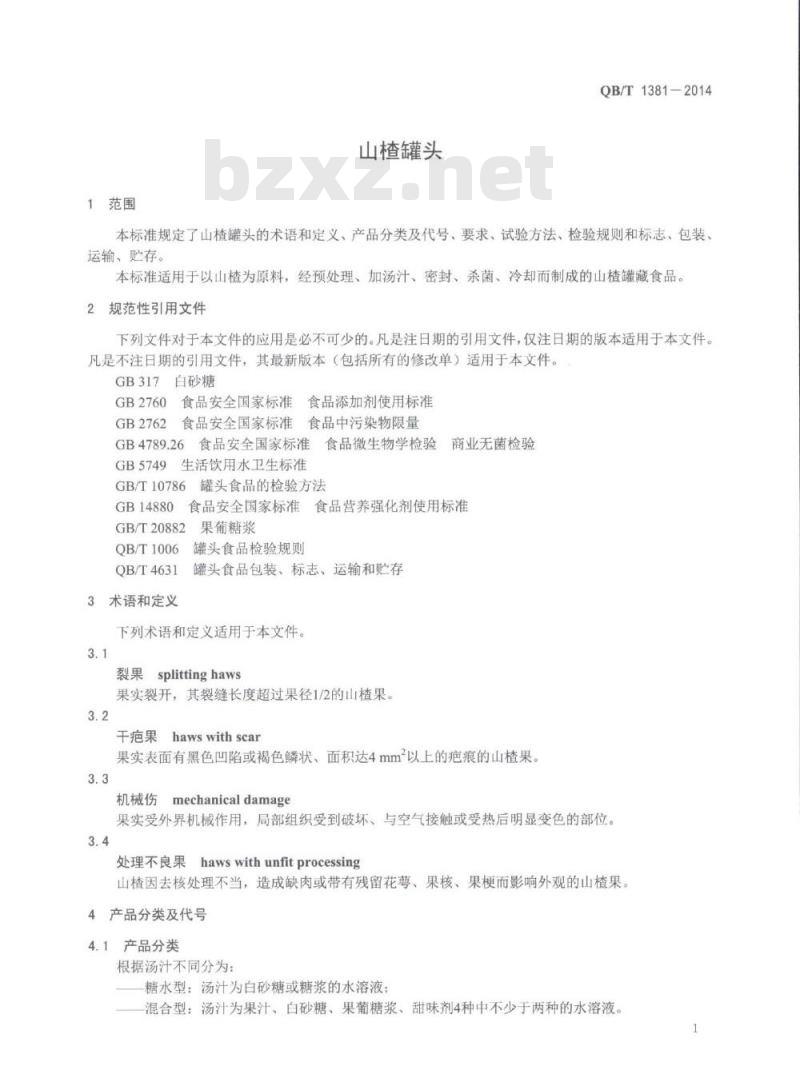 本标准代替QB/T1381-1991《糖水山楂罐头》,与QB/T1381-1991相比,除编辑性修改外主要技术变化如下: