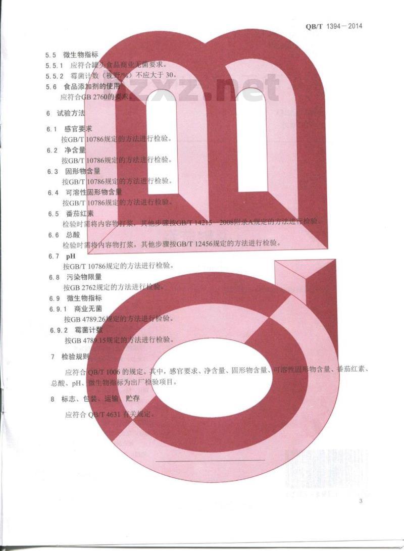 应符合QB/T1006的规定。其中,感官要求、净含量、固形物含量、可落性固形物含量、番茄红素、总酸、pH、