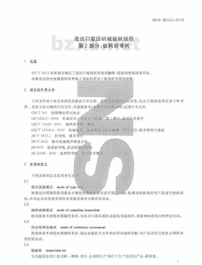 SN/T0813的本部分规定了进出口板料折弯机的抽样、检验和检验结果判定。本部分适用于金属板料折弯加工用途的进出口板料折弯机的检验,2规范性引用文件