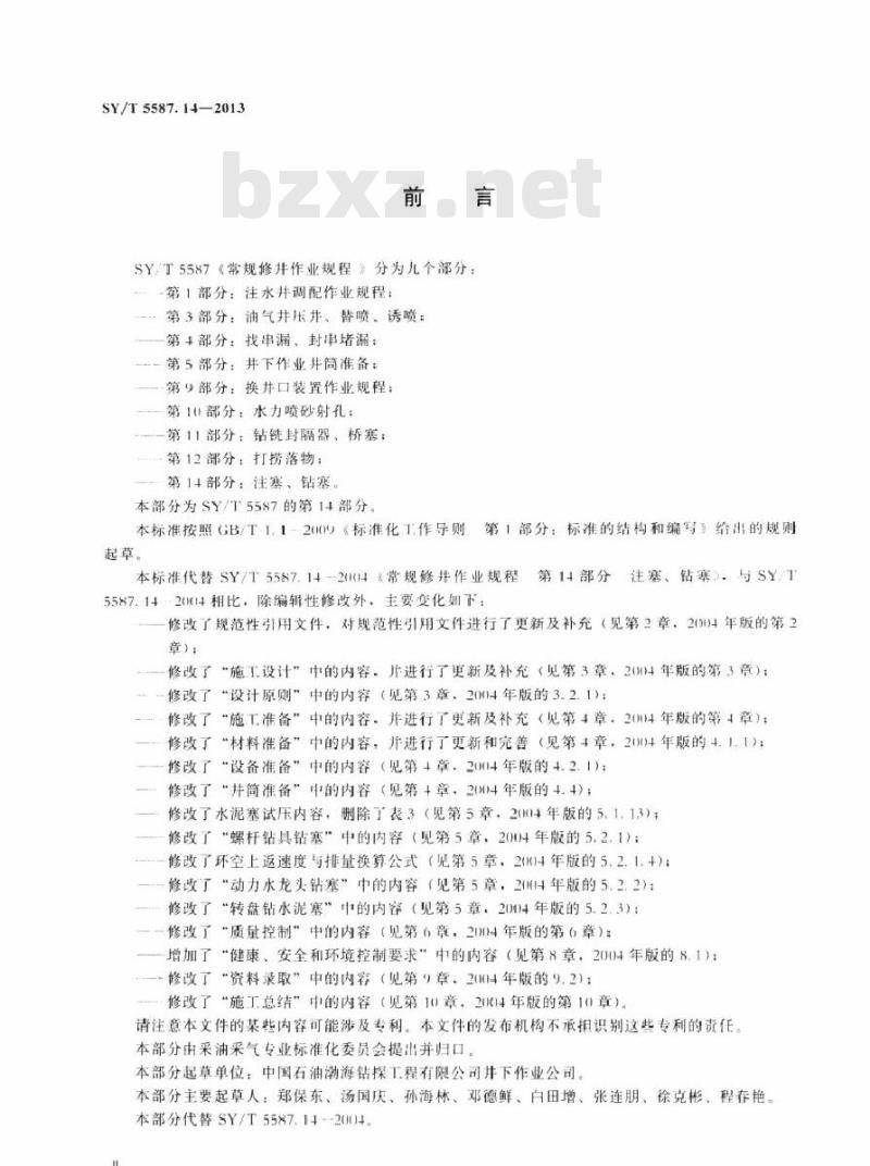 一修改了“施工设计”中的内容,并进行了更新及补充(见第3章,2004年版的第3章);-修改了“设计原则”中的内容(见第3章,2004年版的3.2.1);修改了“施工准备”中的内容,并进行了更新及补充(见第→章,2004年版的第4章):-修改了“材料准备”中的内容,并进行了更新和完善(见第+章,20)+年版的+.1.1);修改了“设备准备”中的内容(见第+章.2004年版的4.2.1):修改了“井筒准备”中的内容(见第+章,2004年版的44);修改了水泥塞试压内容,删除了表3(见第5章,2004年版的5.1.13);修改了“螺杆钻具钻塞”中的内容(见第5章,2004年版的5.2.1):修改了环空上返速度与排量换算公式(见第5章,2(K)4年版的5.2.1.+);修改了“动力水龙头钻塞”中的内容(见第5章,204年版的5.2.2):修改了“转盘钻水泥塞”中的内容(见第5章,2004年版的5.2.3):一修改了“质量控制”中的内容(见第6章,2004年版的第6章):增加了“健康、安全和环境控制要求”中的内容(见第8章,2004年版的81):一修改了“资料录取”中的内容(见第9章,204年版的9.2):修改了“施工总结”中的内容(见第10章,20014年版的第10章)。请注意本文件的某些内容可能涉及专利。本文件的发布机构不承担识别这些专利的责任本部分由采油采气专业标准化委员会提出并归口本部分起草单位:中国石油潮海钻探工程有限公司井下作业公司。本部分主要起草人:郑保东、汤国庆、孙海林、邓德鲜、白田增、张连朋、徐克彬、程春艳。本部分代替SY/T5587.1+--20H+。SY/T5587.14—2004所代替标准的历次版本发布情况为:SY/T5587.141993:
