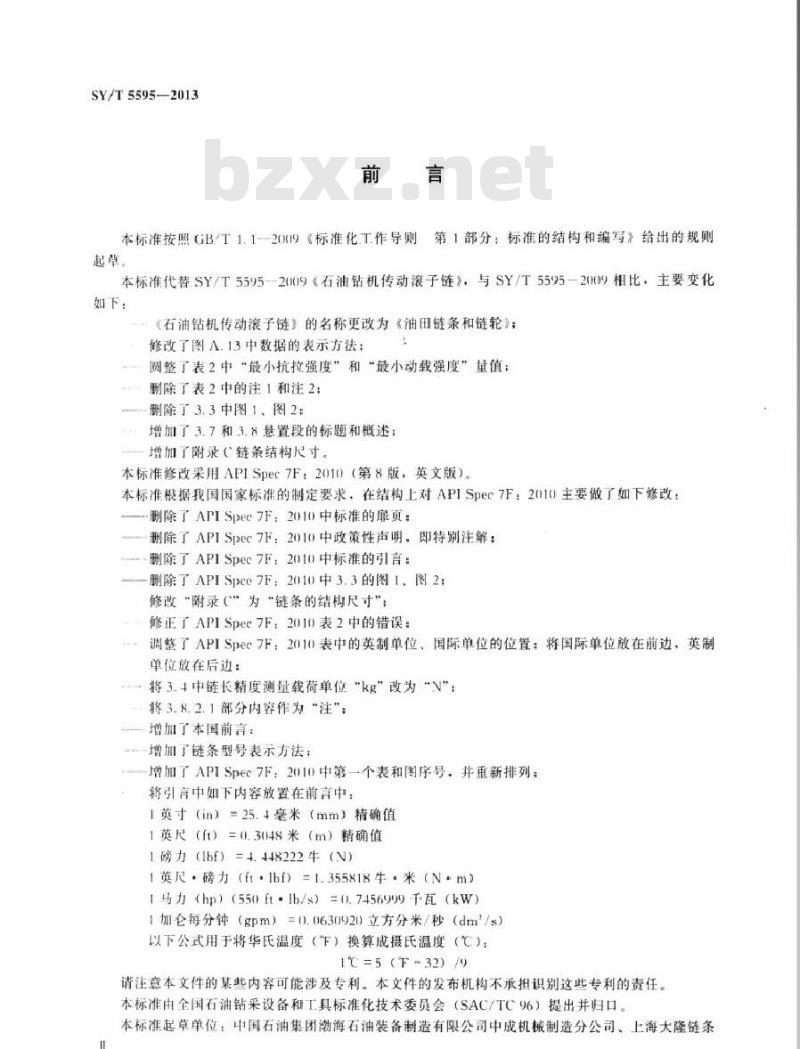 请注意本文件的某些内容可能涉及专利。本文件的发布机构不承担识别这些专利的责任。本标准由全国石油钻采设备和工具标准化技术委员会(SAC/TC96)提出并归口。本标准起草单位:中国石油集团渤海石油装备制造有限公司中成机械制造分公司、上海大隆链条厂、吉林大学链传动研究所、宝鸡石油机械有限责任公司。本标准主要起草人:许大庆、刘金同、吴昆璇、徐冠军、朱国仁、孙娟。本标准代替了SY/T5595-2009。