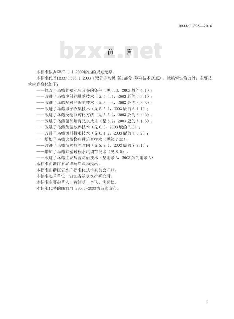 修改了乌养殖池应具备的条件(见3.3,2003版的4.1);改进了乌注射剂量的技术(见5.4.1,2003版的6.3.1);改进了乌配对产卵的技术(见5.4.3,2003版的6.3.3);改进了乌卵子收集技术(见5.5.1,2003版的6.4.1);改进了乌受精卵孵化方法(见5.5.2,2003版的6.4.2);改进了乌苗种培育肥水技术(见6.2,2003版的7.1.3);改进了乌鱼苗放养技术(见6.3,2003版的7.2):改进了乌饵料投喂技术(见6.4.2,2003版的7.3.2)增加了乌大规格鱼种培育技术(见第7章):改进了乌苗种放养时间(见8.3.1,2003版的8.3.1):增加了乌疆养殖过程水质调节技术(见8.5)。改进了乌主要病害防治技术(见附录A,2003版的附录A)本标准由浙江省海洋与渔业局提出。本标准由浙江省水产标准化技术委员会归口。本标准起草单位:浙江省淡水水产研究所。本标准主要起草人:黄鲜明、李飞、沈勤松。本标准代替的DB33/T396.1-2003为首次发布。1