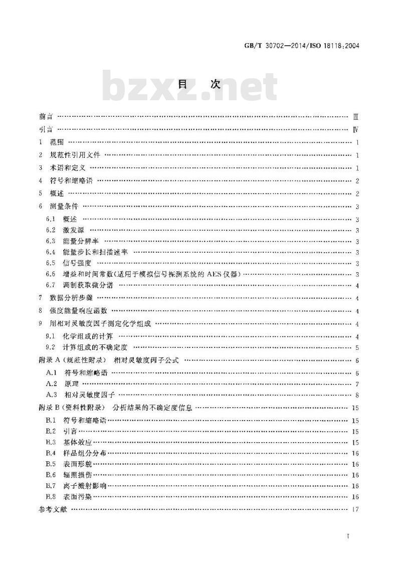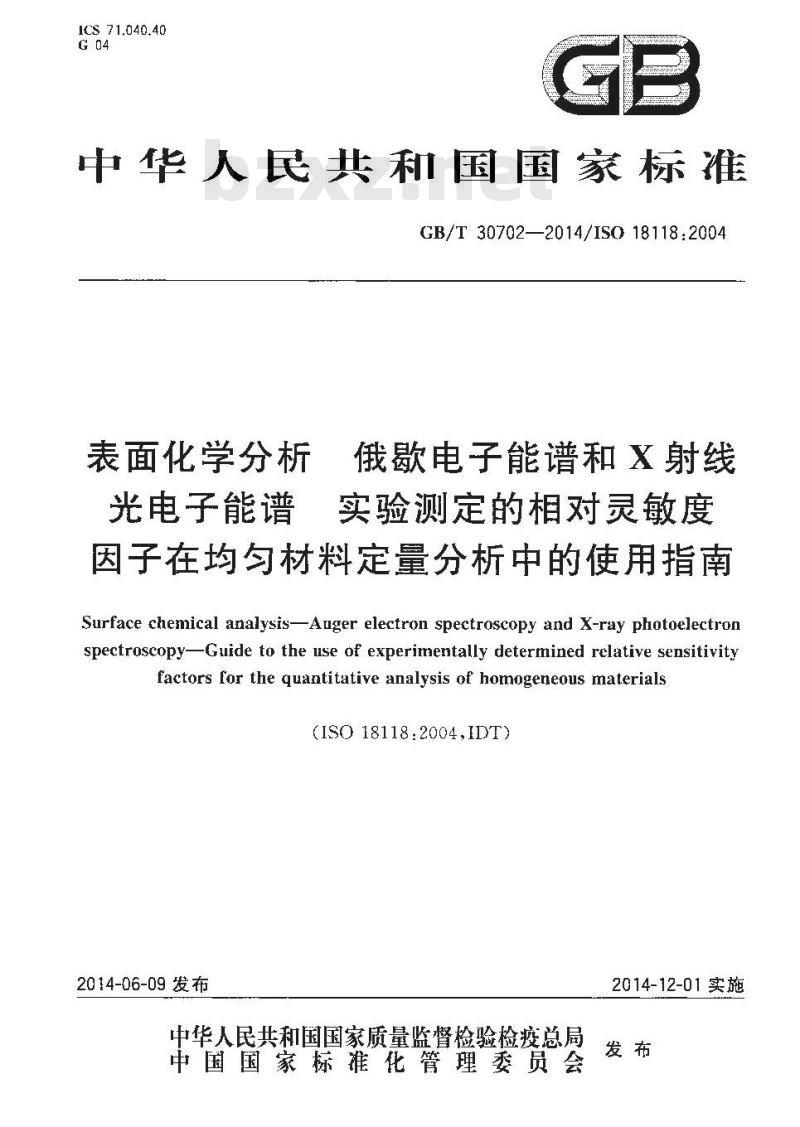 GB/F 30702--2014/[S0 18118:2004表面化学分析俄歇电子能谱和X射线光电子能谱实验测定的相对灵敏度因子在均匀材料定量分析中的使用指南本标准规定了在俄歇电于能谱和X射线光电子能谱均句材料定量分析中相对灵敏度因子的实验测量和使用指南。