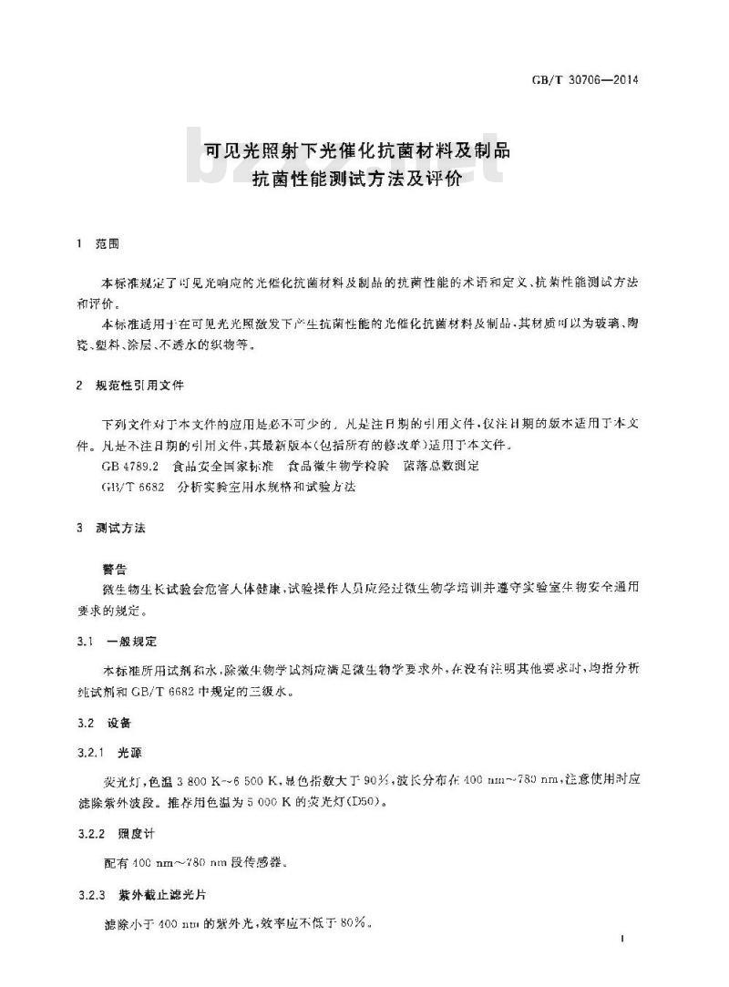 本标准适用于在可见光光照激发下生抗菌性能的光催化抗菌材料及制品·其材质川以为玻离,陶瓷塑料、涂层、不透水的织物等。2规范性引用文件