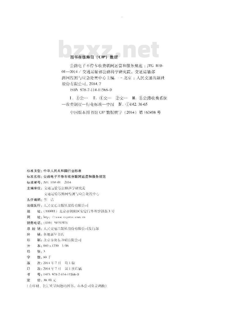 公路电产不停车收费联网运营和服务规范:J1B10-01一2014/交通运输部公路科学研究院,交运输部路网监测与成急处荒中心编,北:人民交迪出版社股份有限公司,2014.7