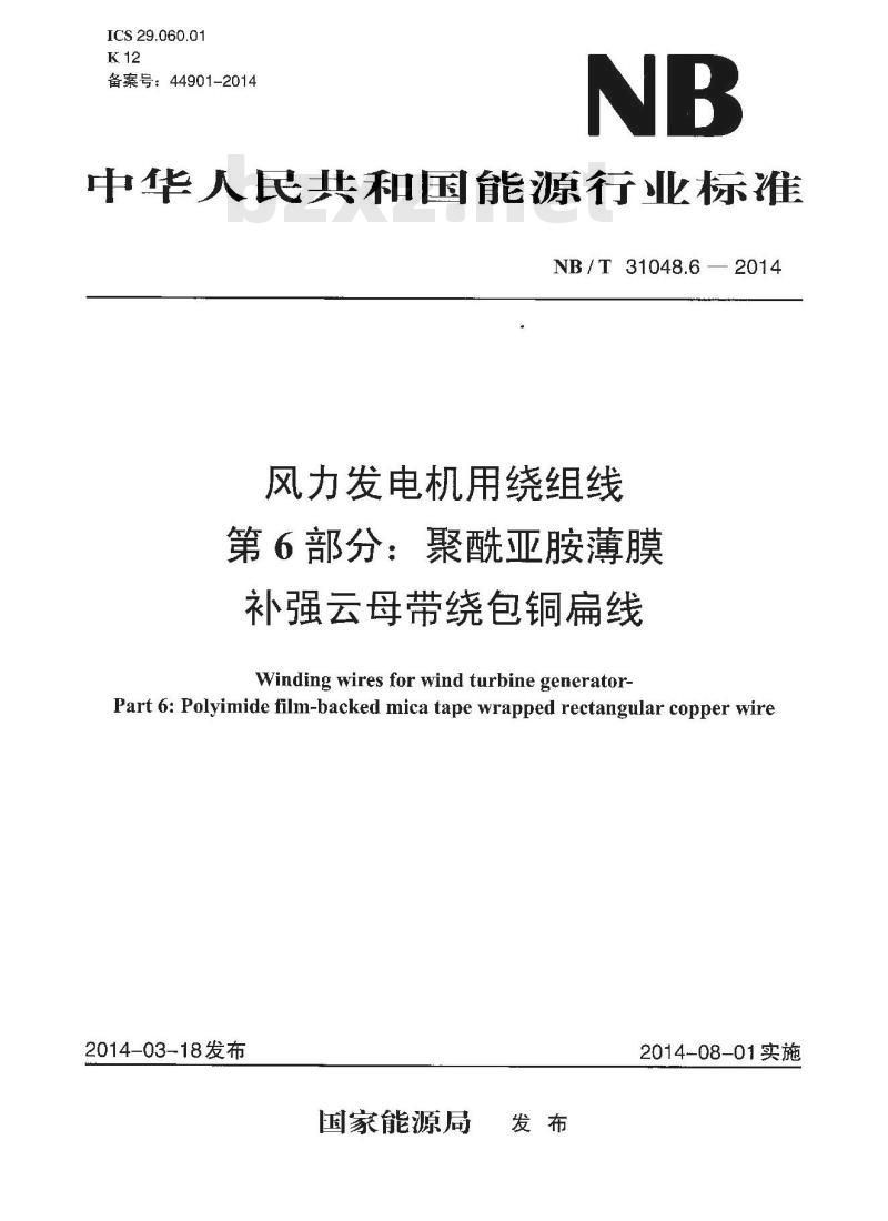 - NB/T 31048.6-2014 风力发电机用绕组线 第6部分 聚酰亚胺薄膜补强云母带绕包铜扁线