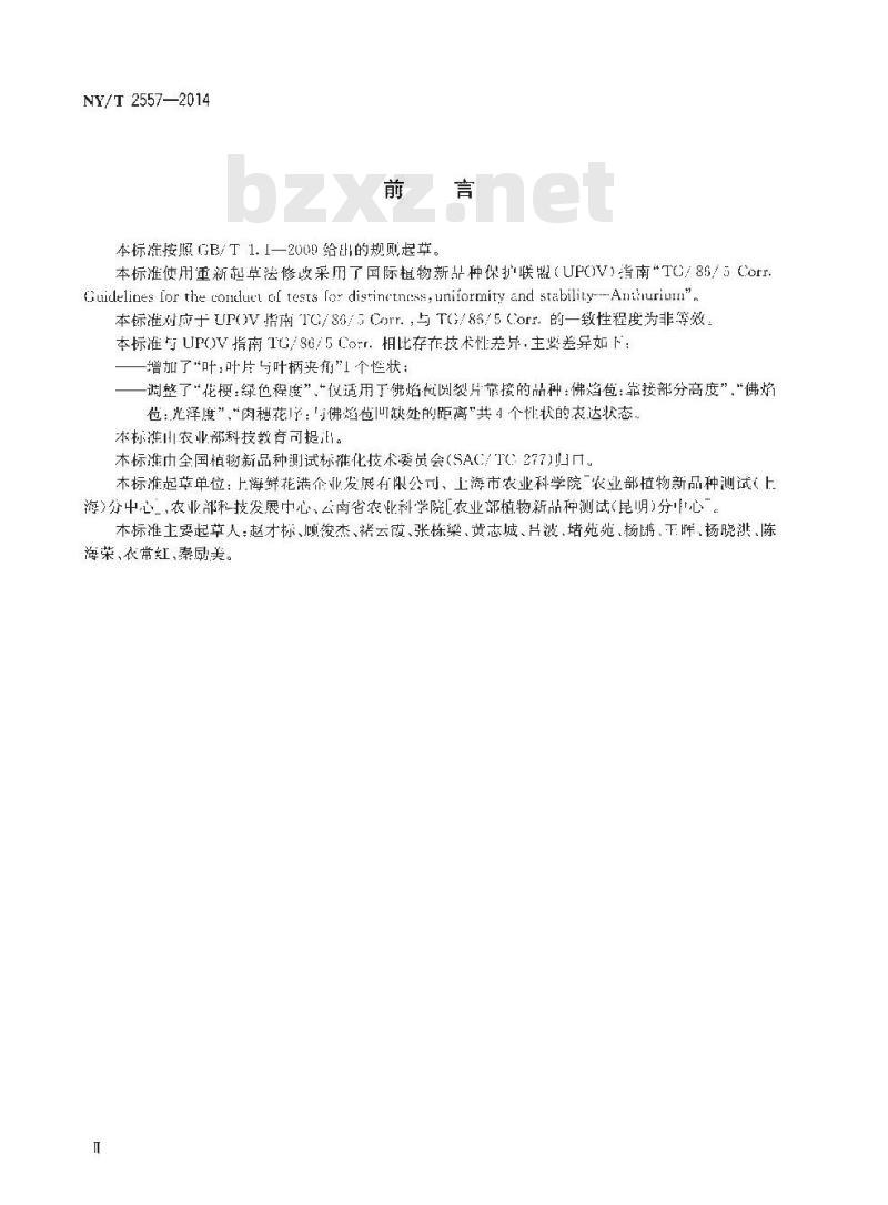 本标准按照GB/T1.1一2009给比的规则起草。本标准使用重新起草法修收采用了国际植物新种保护联盟(UP(V)指南\TG/8S/5Corr.Guidelines for the conluri cf tests for distinctnrs, uniiormity and stability--Anthuriuin\本标准对应于UP(OV指南TG/80/5Carr,与TG/86/5(orr.的一致性程度为非等效本标准与 UPV指南 TC/8G/5Co:r.相比存在技术性差异,主些差异如下:-增加了“叶:叶片与叶柄夹角”I个性状:调整了“花梗:绿色程度”“仪适用丁佛焰旬例裂片靠接的品种:佛焰苞:靠接部分高度”,“佛焰苞:光铎度”“肉穗花:佛焰苞凹缺处的距离\共4个性状的衣达状态,求标雄山农业部科技教育可提。本标准巾全国植物新品种测试标雅化技术委员会(SA(/TC:277)归本标雅起草单位:上海鲜花港企业发展有限公可、工海市农业科学院农业部植物新品种测试(上海)分中心农业部科技发展中心、云肖省农业科学院[农业部植物新品种测试(昆明)分心。本标准王妄起草人:赵才标、顺俊杰、褚云霞、张株梁,黄志城、片被、堵苑苑,杨、下晖.杨晓洪、陈海荣、衣常红、秦励美。
