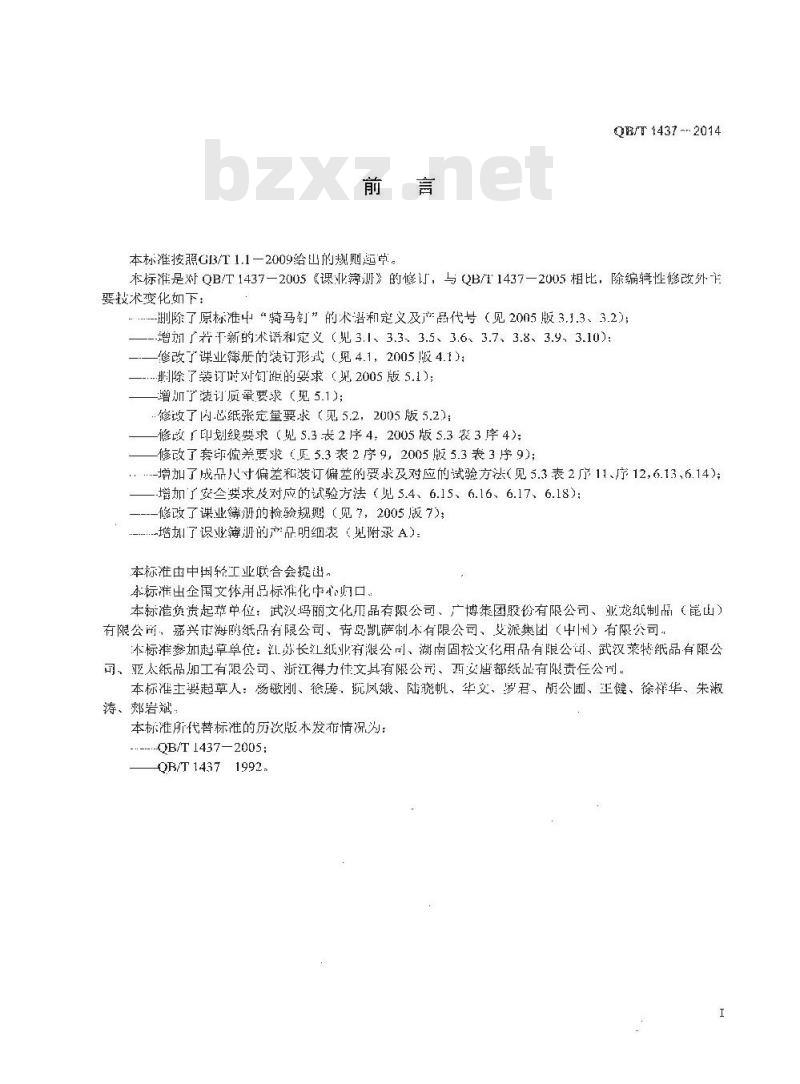-删除了原标准中“骑马钉”的术语和定义及产品代号(见2005版3.3.3、3.2);蹭剂了考干新的术语和定义(见 3.1、3.3、3.5、3.6、3.7、3.8、3.9、3.10);修改了课业簿册的装订形我(见4.1,2005版4.1):期除了装订时对钉距的要求(2005版5.1);增加了装订质罩要录(见5.1);修改了内心纸张定量要求(见5.2,2005版5.2;修改「印划线要求(见5.3丧2序4,2005版5.3表3序4);修改了套即偏差要求(更5.3表2序9,2005版5.3表3序9);..-增加了成品尺寸偏差和装订偏差的要求及对应的试验方法(见5.3表2序11、序12,6.13,6.14);增加了安全要求及对应的试验方法(见5.4、6.15、6.16、6.17、6.18):修改了课业等研的检验规购(见7,2005版7):加了识业簿期的产品明细表(见附录A):本标准由中国轻工业联合会提出。本标准出全国文体用品标准化心归口、本郊德负责起范单位,武汉丽文化几品有限公司、广博集团股份有限公司、业龙纸制通(鼠山有限公商,嘉兴市海鸥纸品有限公司,青岛凯萨制小有限公司,支派集团(中国)有限公司,本标准参加起草单位:江弥长江纸业有限公司、湖南固松文化用品有限公司、武汉莱特纸品有限公司、亚太纸品阳工有限公司、渐江得力估文县有限公荒、西安唐都纸品有限责任公司。本标主婆起草人:杨刚、徐腾,凤娥、陆骁帆、华文、岁君、崛公圃、王健、徐雄华、朱淑涛、郏岩斌